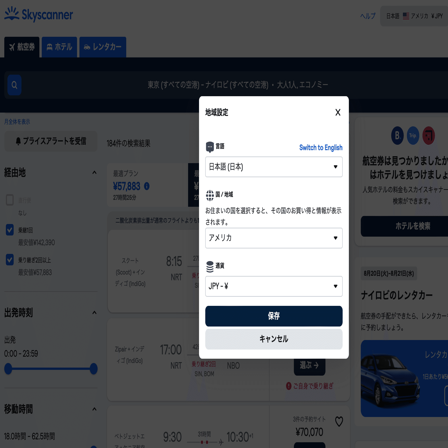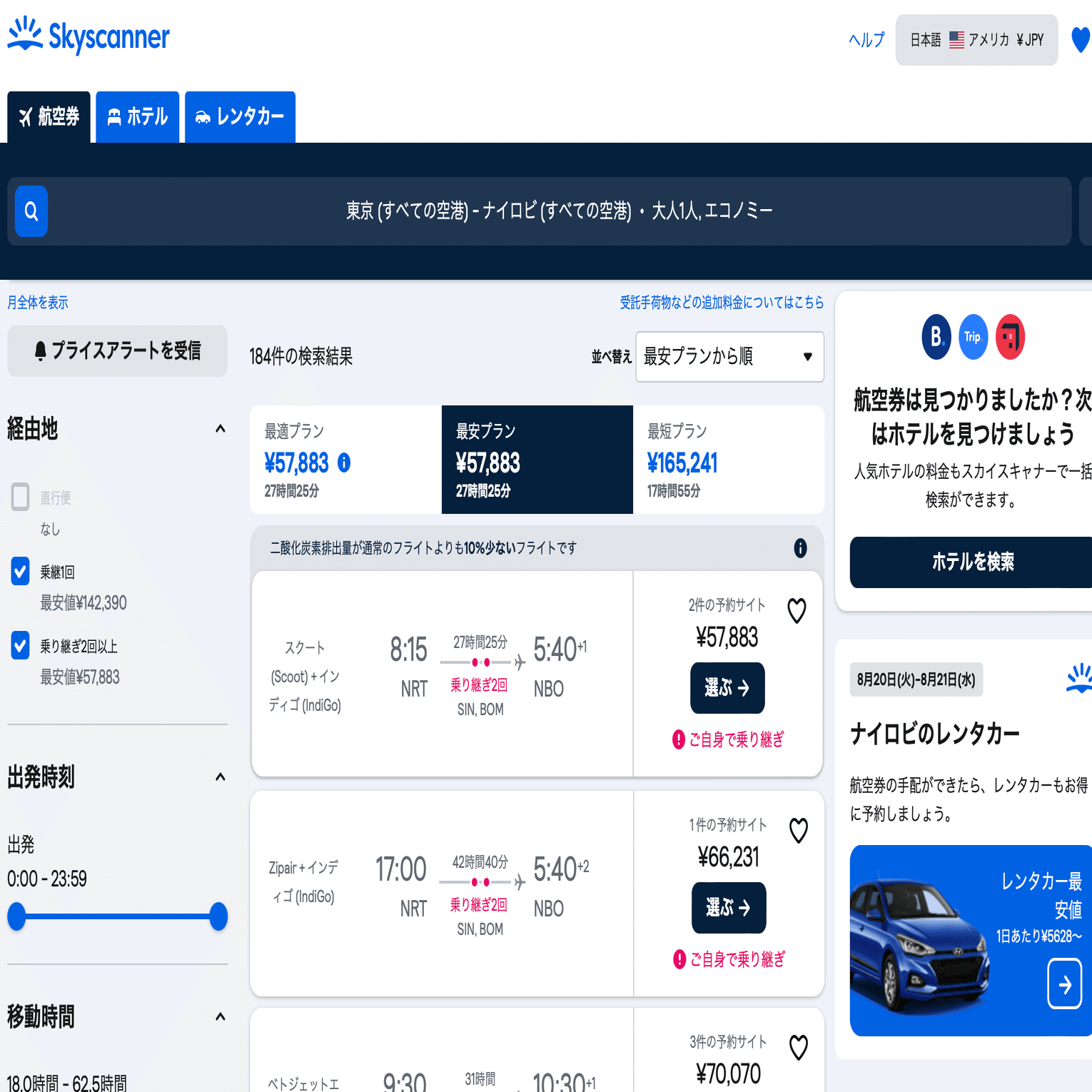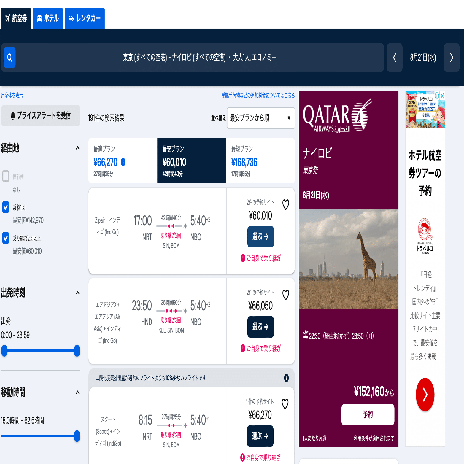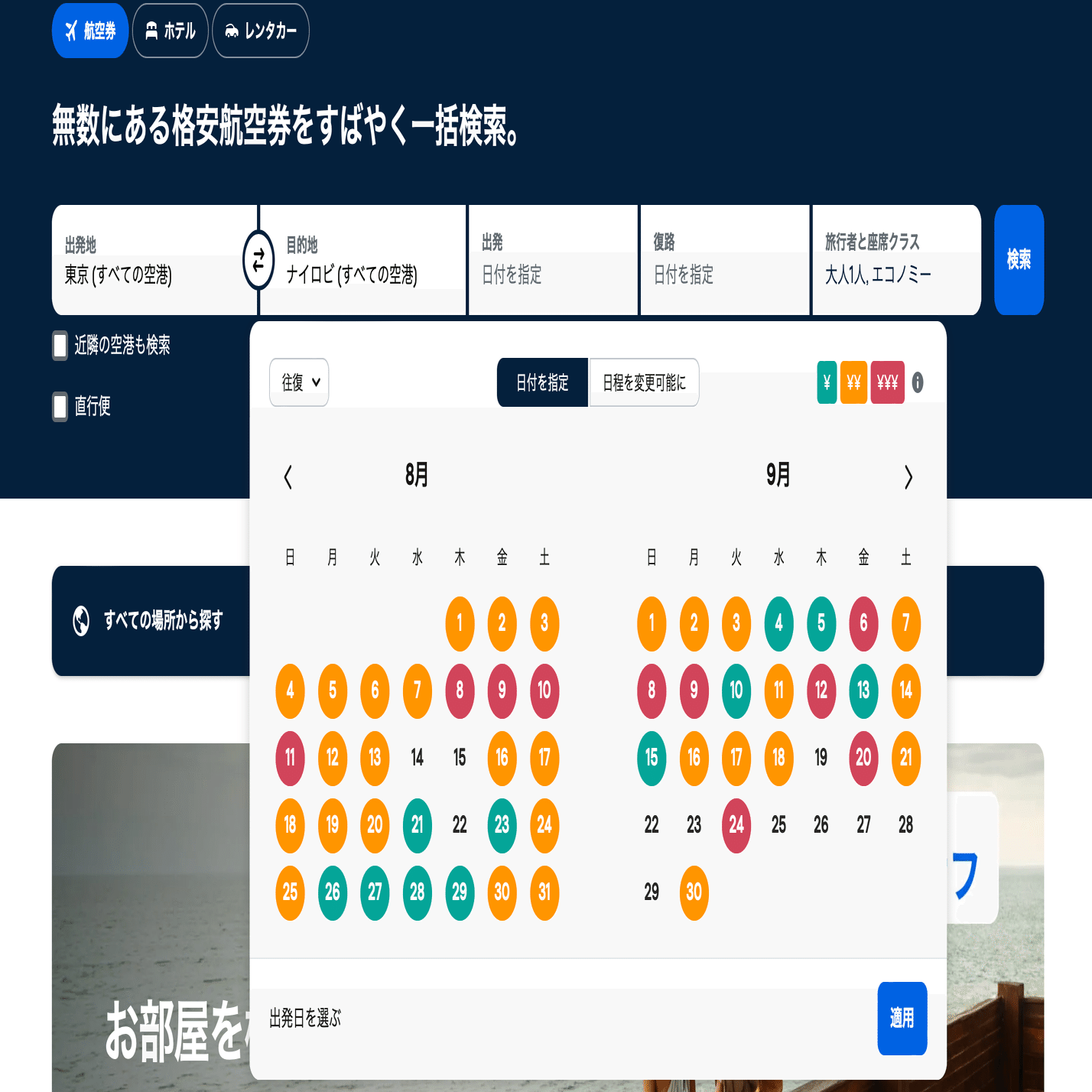 実際にどのように操作するか見ていきましょう。試しに、今回は夏休みにケニアのナイロビに行きたいと思ったとします。