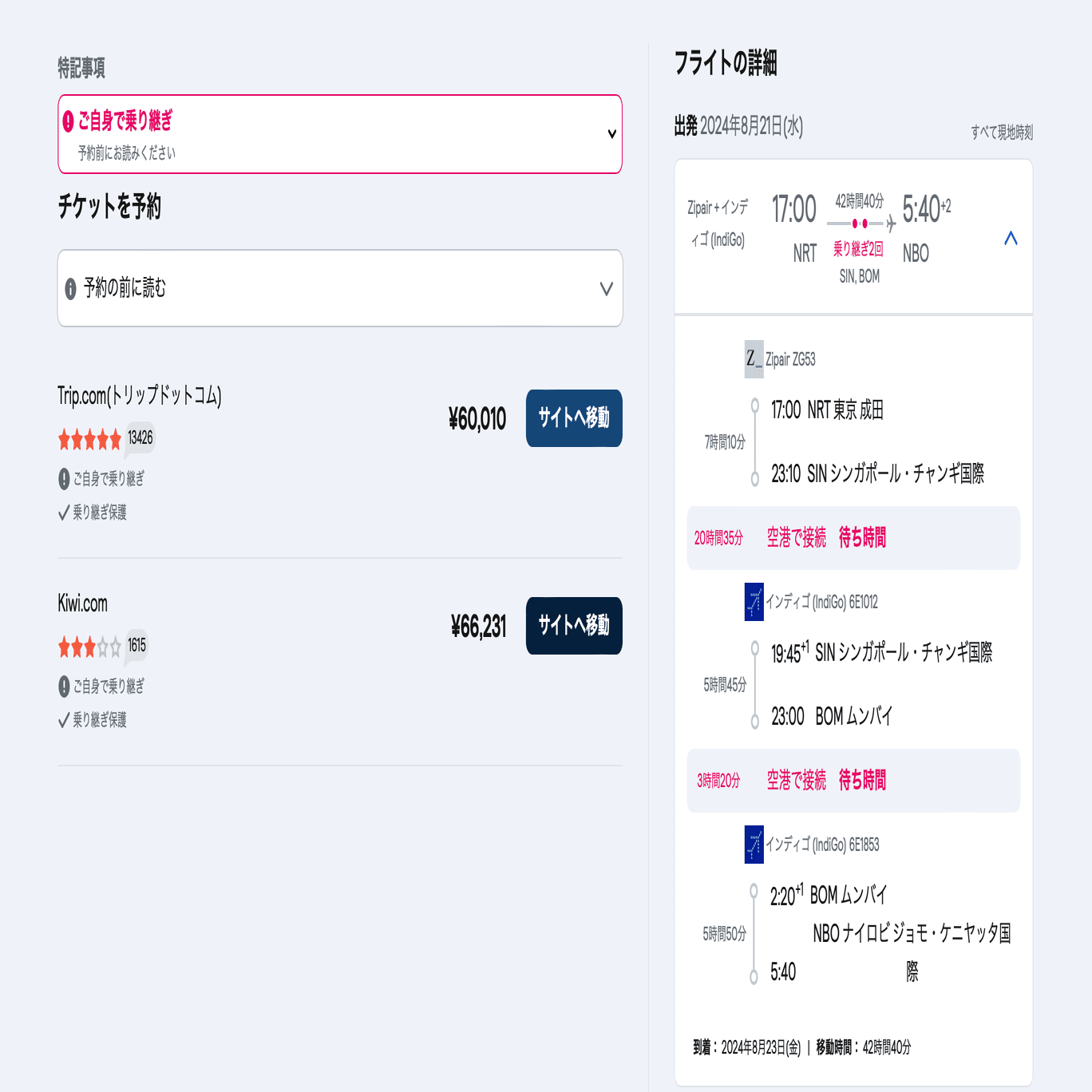 時間や乗り継ぎ時間も表示されていてひと目で情報を確認できるのが特徴です。42時間かかることになっていますが、これは乗り継ぎ時間によるものです。より早く着くには他の便を選択する必要があります。