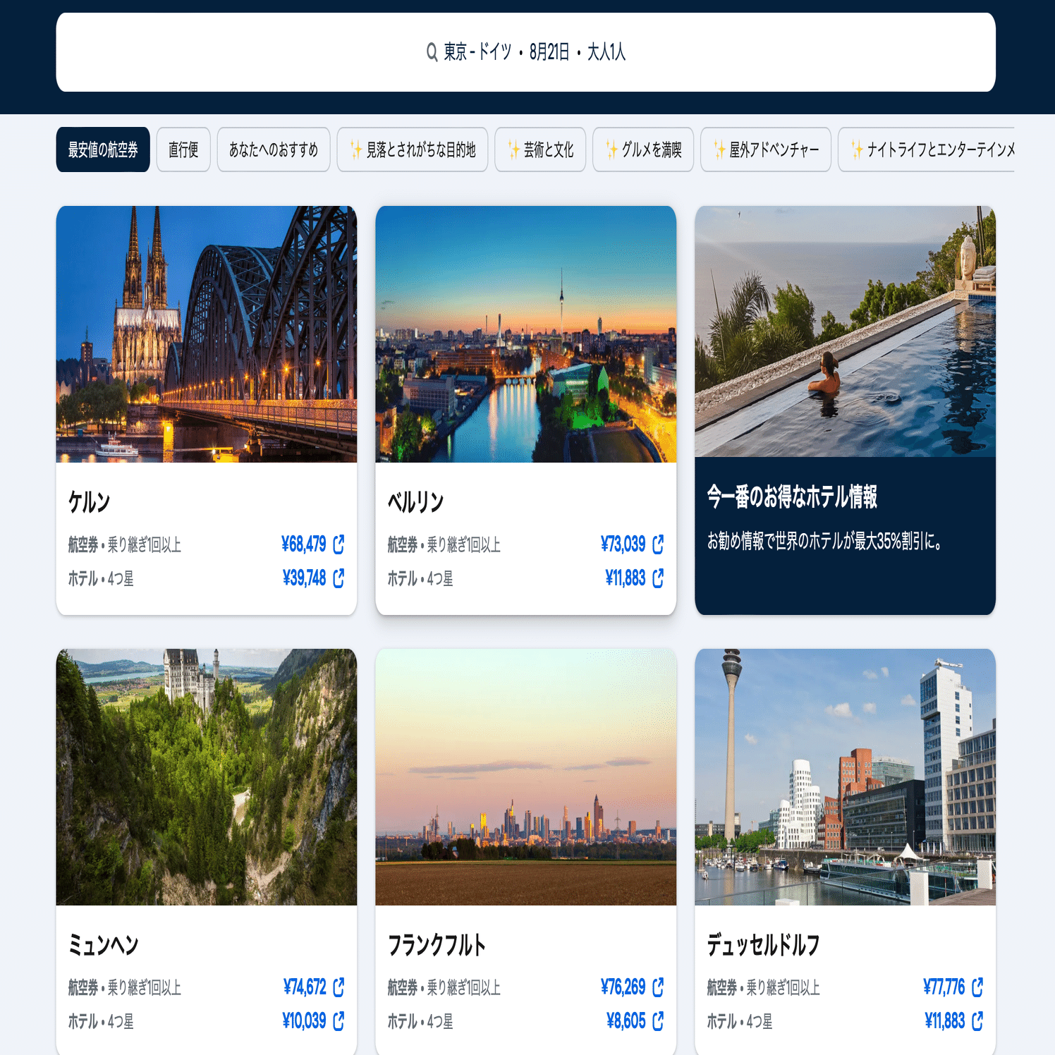 ・日付の柔軟な検索や、国全体や複数の空港からのフライト検索が可能